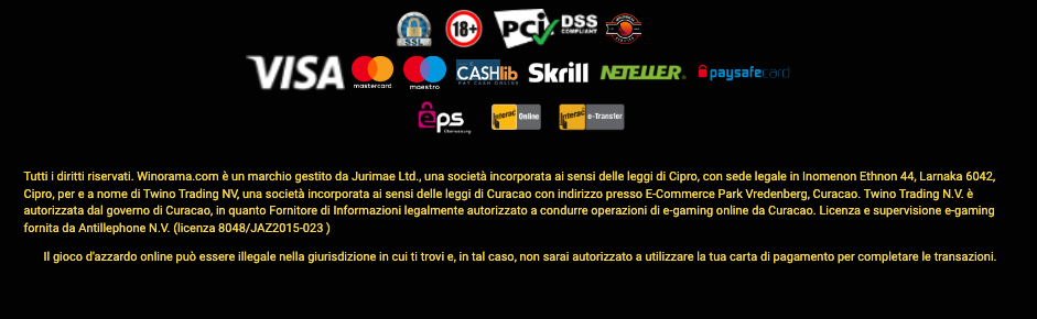 Winorama è un altro casinò gestito dal rinomato marchio Hermione Ltd. Potresti conoscere questo marchio grazie ad altri siti famosi come Gratorama. Winorama possiede licenze a Cipro e Curaçao, il che garantisce che il casinò abbia fatto grandi sforzi per assicurare equità e sicurezza per i giocatori online. Come molti casinò, utilizza un generatore di numeri casuali per garantire un’esperienza di gioco sicura e divertente. Il sito è protetto dalla crittografia SSL. Il bonus introduttivo senza deposito è un’ottima opzione per i giocatori che desiderano provare i giochi gratuitamente. Tutti amano vincere, e Winorama offre una vasta gamma di giochi online con numerose opportunità di vincita per tutti i giocatori.